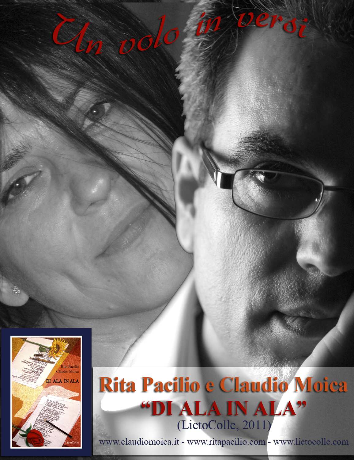 Un filo d’inchiostro lega i due poeti che hanno scritto a quattro mani la raccolta poetica “Di ala in ala” (LietoColle, 2011); simile al filo di un aquilone, ha permesso il volo di Claudio Moica e Rita Pacilio, metaforicamente simboleggiati da una rosa e un girasole – elementi ripresi sin dal dipinto di copertina di Walter Buscarini – che offrono un dialogo in versi su un tema di valenza universale: l’Amore. Un viaggio comune – come cita Dante Maffia nella prefazione – dove però ognuno conserva la propria essenza. Un dialogo intenso in cui dolore, gioia, speranza, amore, sconfitte, cadute e risurrezioni vagano nell’indistinto e non sanno trovare la direzione della bussola, fino a quando, appunto nel consegnare al foglio le emozioni, hanno trovato la necessità di sentire la responsabilità di vivere nel quotidiano come due esseri non più in balia della deriva.