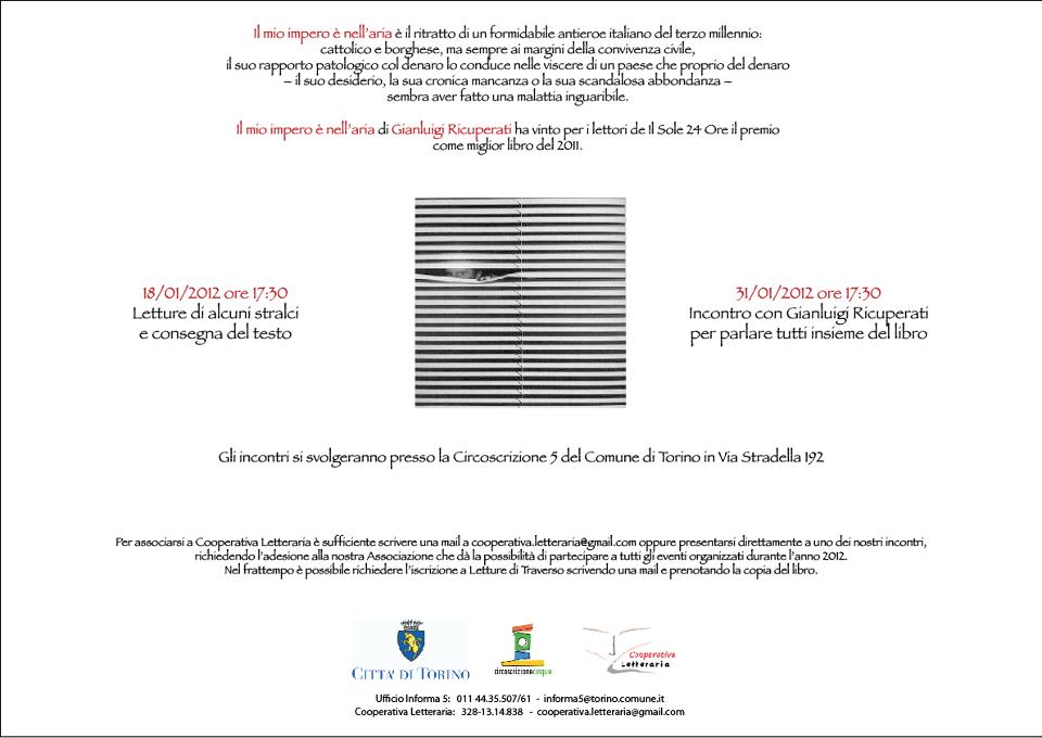 Il primo appuntamento di Letture di Traverso -gruppo di lettura pensato all’interno del “Progetto Babel-Sulle tracce di una radice comune”- è dedicato a “Il mio impero è nell’aria” di Gianluigi Ricuperati, Minimumfax.