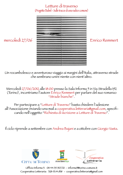 Nell’ambito del gruppo “Letture di traverso”, presso la Sala Informa 5 di Via Stradella 192 Torino, incontriamo l’autore Enrico Remmert per parlare del suo romanzo “Strade bianche”.
