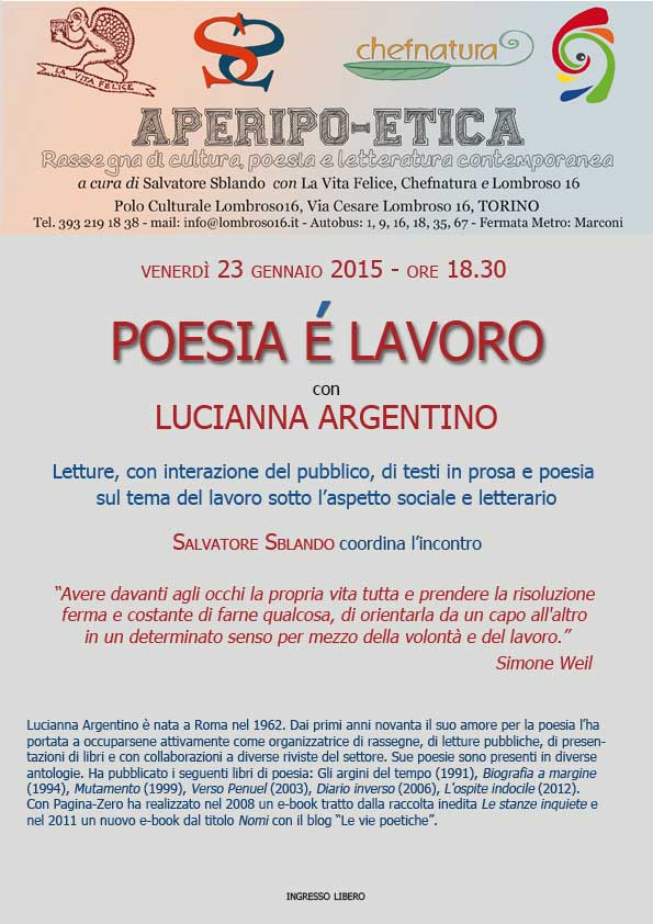 APERIPO-ETICA Un appuntamento mensile, presso i locali di Lombroso 16 a Torino (Via Cesare Lombroso 16 – Tel. 393 219 18 38;www.lombroso16.it) per incontrare poeti, autori e opinionisti su temi letterari contemporanei con l’intento di cercare il Senso dell’esistere umano, il significato profondo etico-esistenziale (eventuale) della vita del singolo e del cosmo che lo include.