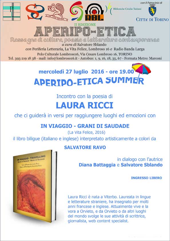APERIPO-ETICA Un appuntamento mensile, presso i locali di Lombroso 16 a Torino (Via Cesare Lombroso 16 – Tel. 393 219 18 38;www.lombroso16.it) per incontrare poeti, autori e opinionisti su temi letterari contemporanei con l’intento di cercare il Senso dell’esistere umano, il significato profondo etico-esistenziale (eventuale) della vita del singolo e del cosmo che lo include.