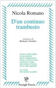 L’utopia – da cui il titolo del componimento con cui D’un continuo trambusto (Passigli, 2018) di Nicola Romano si apre- è caratteristica fondativa dell’essenza poetica. È vagante e atemporale, rigetta la mediocrità del quotidiano e trasporta «autentiche fonie». Su queste si modella una lingua poetica precisa e dolente, scandita dal ricorso a metri classici variamente impiegati. Romano sembra appartarsi in ascolto delle cose, affrescandone la matrice più intima e arginando, nel brulichio del presente, la distanza che separa da esse. A tal proposito, paiono interessanti le considerazioni di Roberto Deidier in prefazione: “[…] Viene da chiedersi, a questo punto, quale sia il vero vissuto di un poeta come Romano. Perché in realtà c’è come una patina sensoriale attraverso la quale i fenomeni giungono al soggetto, per essere filtrati e trasferiti sulla pagina. In questo, Romano è coerente con l’asse percettivo della modernità, a cui però sembra guardare con un certo riservo, cercando (o mirando a cercare) il colloquio con una tradizione più vasta e antica. Insomma, ancora una volta poesia e vita giocano a scambiarsi i ruoli, di qua e di là di uno stesso palcoscenico. Ora Romano è in scena, ora osserva dietro le quinte, ora siede sornione tra il pubblico. Il suo vissuto trapassa, come in un processo di osmosi, tra ciò che gli è più prossimo e saldo e ciò che inevitabilmente crea disturbo e lontananza. Così, allo stesso modo, mutano i suoi toni”.