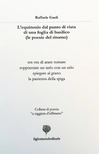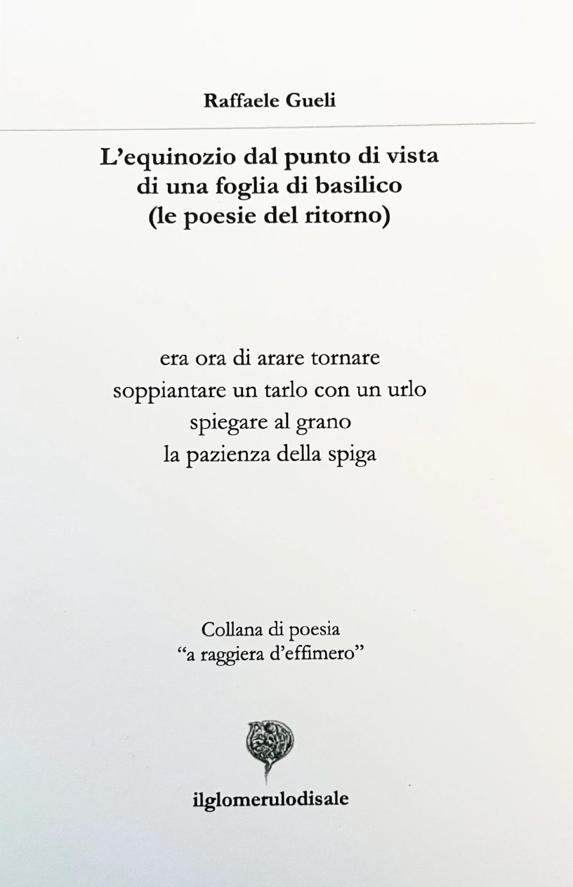 L’equinozio dal punto di vista di una foglia di basilico (le poesie del ritorno) edizioni ilglomerulodisale 2023 di Raffaele Gueli è una silloge poetica ampia e complessa, di esperienza e resistenza, in cui si coglie l’impegno per indicare un’etica nuova e un sistema di valori condivisi. L’opera affronta diversi temi: l’amore, la spiritualità, la natura, i rapporti umani, la critica al mondo d’oggi di cui non riconosce i valori prescritti dalla tecnica e dal mercato: efficienza, funzionalità, produttività, velocizzazione del tempo. In questo panorama il cui colore è l’abitudine / il cui tramonto è l’indifferenza è una fortuna essere scarsi in matematica, come afferma Gueli, essere risorto contorto fuori dato programmato / animale animato senza valore dato. Il momento storico gli richiede di rifiutare l’evidenziatore e sottolineare di mano ferma senza righello, di aprire la porta al cancellino, di percepire la spiritualità antelitteram / col pallottoliere. Sentendosi assediato, il poeta si fa comparsa, cerca un confine / che non divide, tiene. Incredulo della nuova fede nei numeri e nei Big Data, è, come tutti i poeti ingordo di vita, nel senso che ne ricerca il significato profondo, ne tenta l’abisso perché La poesia è carezza sull’abisso. Ma dantescamente Raffaele Gueli non si rivolge a chiunque: La poesia non è di tutti quelli che la leggono. / La poesia è già in cielo / mentre noi la leggiamo sulla terra. Si rivolge soltanto a coloro che sono persone e sanno un po’ di cose sull’amore. …I superstiti d’amori feriti / sono i migliori compagni di viaggio. La sua poesia rende quindi vana la difesa dei significati correnti e con coraggio ne indica altri, Raffaele Gueli si comporta come il mietitore che avanza tagliando le spighe e raccogliendole con speranza e spasmodica attenzione per la vita nella quale Per tutto è l’amore / per le persone nessuno escluso… Ha tanti segreti l’amore: uno è vederlo in molte cose / due concedergli possibilità… Si può moltiplicare… Il poeta disvela le verità della vita, rivolgendo lo sguardo in noi stessi e verso l’alto, per riconquistare la spiritualità perduta: Ho sulla punta delle dita / un segno da spiegare a un foglio / le parole caravelle / calmano la tessitura ossessiva. Il tema della spiritualità, di carattere francescano, semplice e fraterna, percorre tutta la silloge: Abbiamo parlato con Dio / gli abbiamo chiesto i miracoli / e invece noi eravamo i santi. Ho bisbigliato / ti basta lo stesso tetto tutta la vita/ per poter dire amore in mille modi diversi… Dio non è morto. / L’uomo non è ancora risorto. / Questo è il fatto increscioso… Si deve pregare… con le braccia che arrivano / alla fatica buona… Nella poesia che apre la silloge il poeta dichiara di avere ben fisse nella mente alcune utili regole dell’arte del trasloco che servono da mappa per orientarsi nel cammino da un luogo all’altro: sapere chiudere bene e sapere aprire bene, mantenere viva la storia degli equinozi e avere cura di innaffiare il basilico al tramonto. Pianta aromatica, preziosa per il suo profumo, il basilico entra nel complesso titolo della silloge: L’equinozio dal punto di vista di una foglia di basilico (le poesie del ritorno). Unire l’equinozio alla foglia di basilico allude all’equinozio di primavera, alla rinascita della natura, alle prime foglie del basilico e al rinnovarsi del canto dei poeti, tema emblematico di tanta poesia di tutti i tempi. Ma allude anche all’equità armonica tra tutti gli esseri viventi anche i più umili e semplici come la foglia di basilico, di cui non conosceremo mai il punto di vista. Ma non è questo l’importante, perché è giusto considerare, secondo l’autore, anche la foglia di basilico nel numero degli esseri, di cui prendersi cura. L’equa ripartizione del giorno in ore di luce e di buio rimanda inoltre alla semantica della luce e delle tenebre, al bene e al male che si mescolano nell’animo dell’uomo. Il sintagma nominale Poesie del ritorno, in parentesi, spiega da un’altra angolazione l’atteggiamento e il punto di vista del poeta, il suo cammino, visto come un ritorno verso la natura e l’umanità, la libertà è intreccio di legami, la social catena per ricordare Leopardi. In questa prospettiva la poesia che dà il titolo alla silloge giustamente parla dell’arte del trasloco dall’antropocentrismo all’affermazione dell’eguaglianza di tutti gli esseri viventi: Era ora di arare tornare e fare Una calma disamina dell’eroe… L’Universo avrà pure il suo centro / ma io mi tengo stretto ai lati. La poesia di Raffaele Gueli oppone alla logica del possesso la ricerca della “giusta posizione”: Vi scrivo con la punta del minuto / trascino il dito a indicare il pino / Scavo nella rarefazione del tronco… stritolo un verso / per spremerci succo di poesia / tratteggio a respiro / lo sfogliare dei rami / tra fiati di libeccio… Il poeta si sottrae al riduzionismo e alla semplificazione odierna del linguaggio, cerca “l’orizzonte di senso” e ne indica l’attuale assenza, a cui non si rassegna, e che vuole colmare con la sua scrittura: Siamo una babele disillusa… fuggo da te mentre di te ho bisogno / le domande sbagliate sono la strada maestra / per le risposte giuste / residui di cielo / appiccicano agli occhi stralci di tempo trascorso. La parola poetica di Gueli dischiude le potenzialità del linguaggio, allude, evoca, provoca, avvicina l’esperienza quotidiana all’assoluto, scardina i significati e il senso comune insistendo su consonanze ed assonanze: Trionfo / tonfo / pomfo; sono sperso, sparso-arso raso non soltanto per un effetto musicale, ma per sottolineare la connessione emotiva e semantica del suo dettato poetico. L’opera ha un impianto di largo respiro in cui si saldano slancio del sentimento e dell’immaginazione e tensione espressiva. La struttura metrica elastica asseconda la variazione di tempo e ritmo: H
